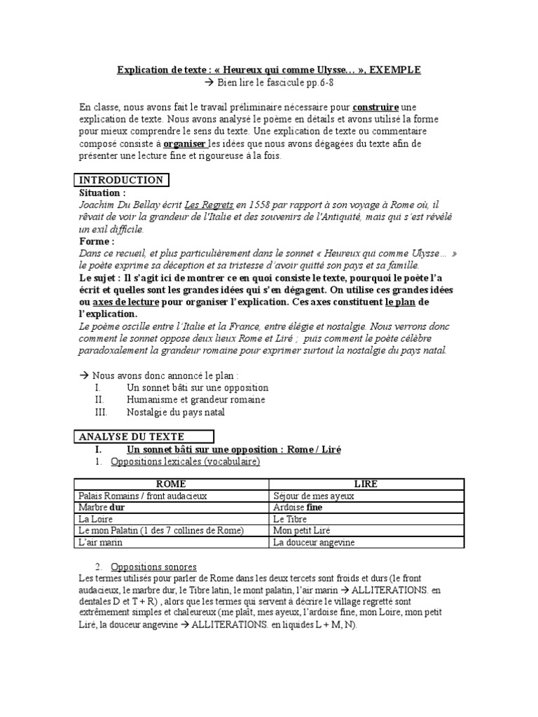 Votre réflexion personnelle peut évidemment vous mener à dautres pistes de lecture. Heureux qui comme Ulysse de Du Bellay Introduction. EXEMPLE DE PLAN En classe nous avons fait le travail préliminaire nécessaire pour construire un commentaire composé.