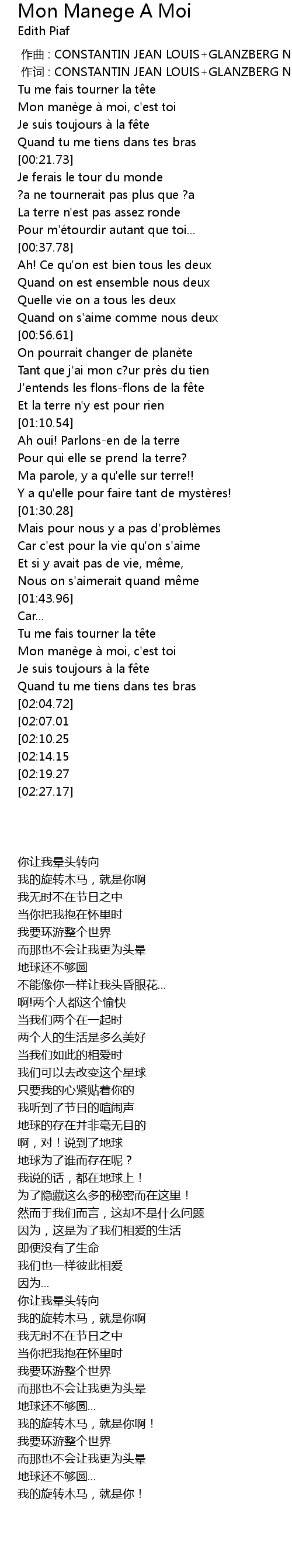 Mon manège à moi cest toi Je suis toujours à la fête Quand tu me tiens. Tu Me Fais Tourner La Tete. Official lyrics by Édith Piaf.