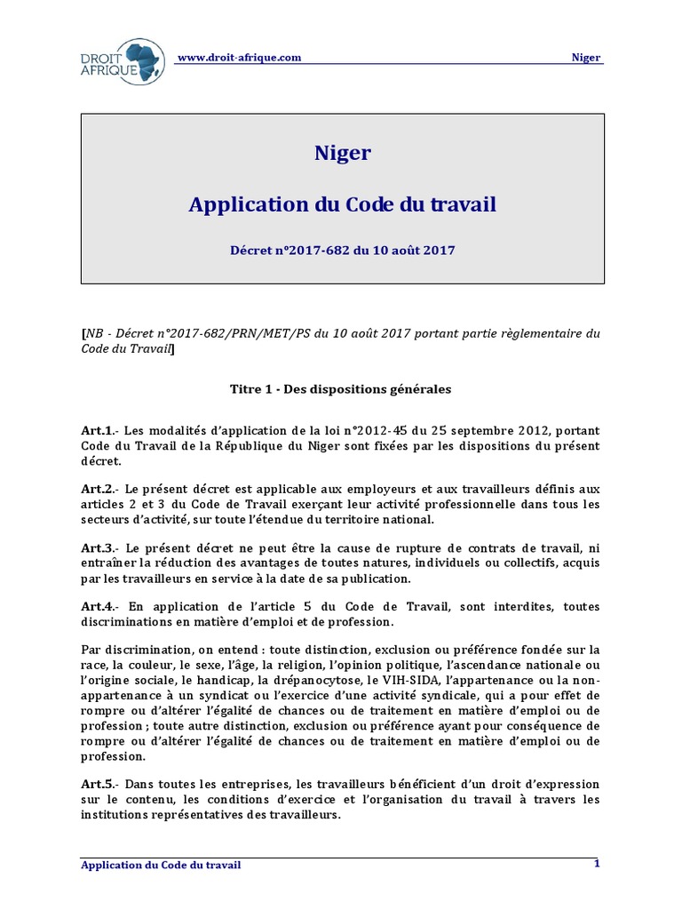Niger Decret 2017 682 Application Code Du Travail Pdf Interim Travail Travail